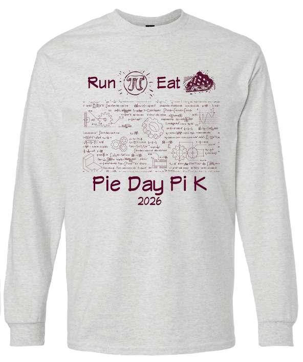 Our Pie Day Pi K "Equations" race shirt has been very popular and has sold out each year.  The price is $19 for this quality shirt for your Equations collection.  This year we have a ash colored long-sleeve shirt.  See the proof below. Shirts must be ordered by March 1 (although a few sizes might be available for a short time after that).